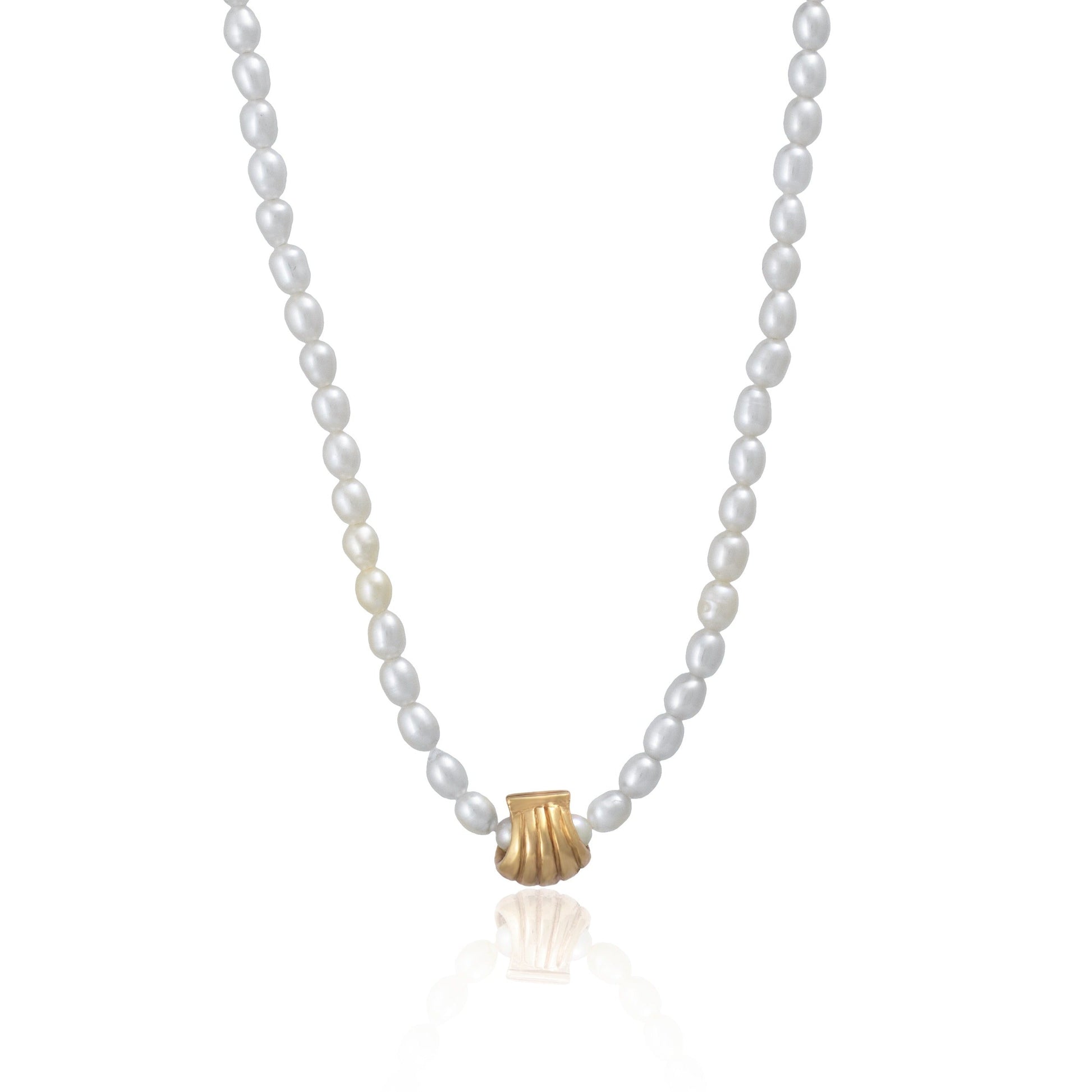 Hand strung on stretchy cord so you can easily put it on & offMade from Freshwater Pearls, each necklace is different due to the natural & irregular shapes of the pearlsClam Shell Pendant is made from solid .925 Recycled Sterling Silver & plated with 3 layers of 18kt Gold
